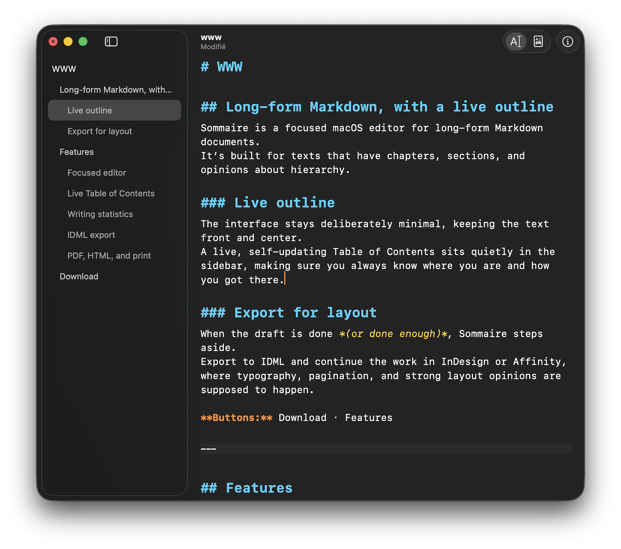 Sommaire est un éditeur macOS natif pour les longs documents Markdown. Il est conçu pour les textes qui ont des chapitres, des sections et des opinions sur la structure.
